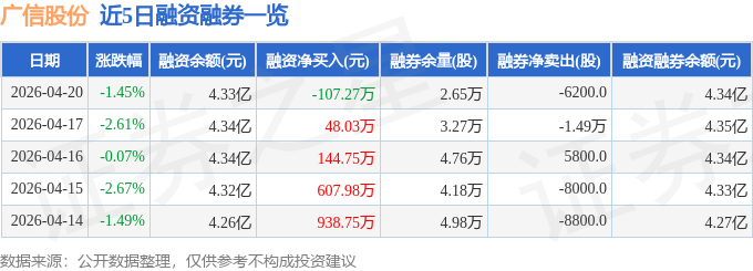 证券之星消息,截至2026年4月20日收盘,广信股份(603599)报收于13.62元,下跌1.45%,换手率1.4%,成交量12.7万手,成交额1.72亿元。