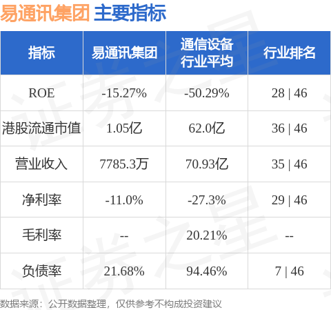 易通讯集团港股市值1.05亿港元,在通信设备行业中排名第36。主要指标见下表: