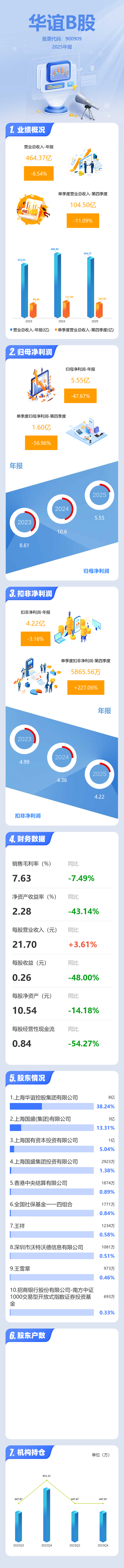 证券之星消息,华谊B股2025年年报显示,当年度公司主营收入464.37亿元,同比下降6.55%;归母净利润5.55亿元,同比下降47.68%;扣非净利润4.22亿元,同比下降3.17%;其中2025年第四季度,公司单季度主营收入104.5亿元,同比下降11.1%;单季度归母净利润1.6亿元,同比下降56.97%;单季度扣非净利润5865.56万元,同比上升227.07%;负债率56.85%,投资收益5.19亿元,财务费用3.62亿元,毛利率7.63%。