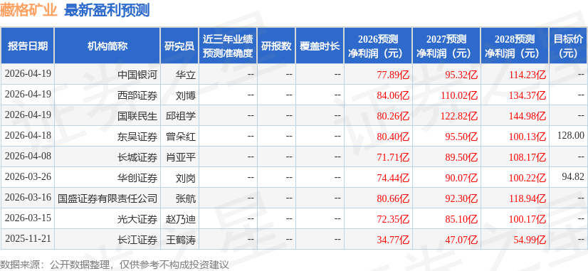 量价齐升,铜矿投资收益快速增长。(1)销量/产量:2026Q1巨龙铜业矿产铜销量/产量分别为6.05/6.04万吨,同比+30.4%/+30.2%,环比+17.9%/+17.7%;2026Q1巨龙铜业矿产铜产量完成全年目标中值的20%,2026年1月23日,巨龙铜业巨龙铜矿二期工程正式建成投产,在现有15万吨/日采选工程基础上,巨龙铜矿新增生产规模20万吨/日,形成35万吨/日的总生产规模。(2)投资收益:2026Q1公司取得巨龙铜业投资收益13.1亿元,同比+115.4%,环比+57.9%。(3)铜价:根据生意社数据,2026Q1现货铜均价为10.1万元/吨,同比+30.0%,环比+12.9%。