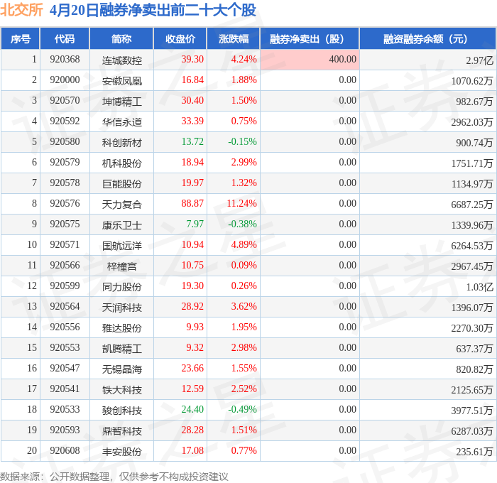 北交所融券净卖出前三分别为:连城数控(920368)融券净卖出400股,前20具体见下表: