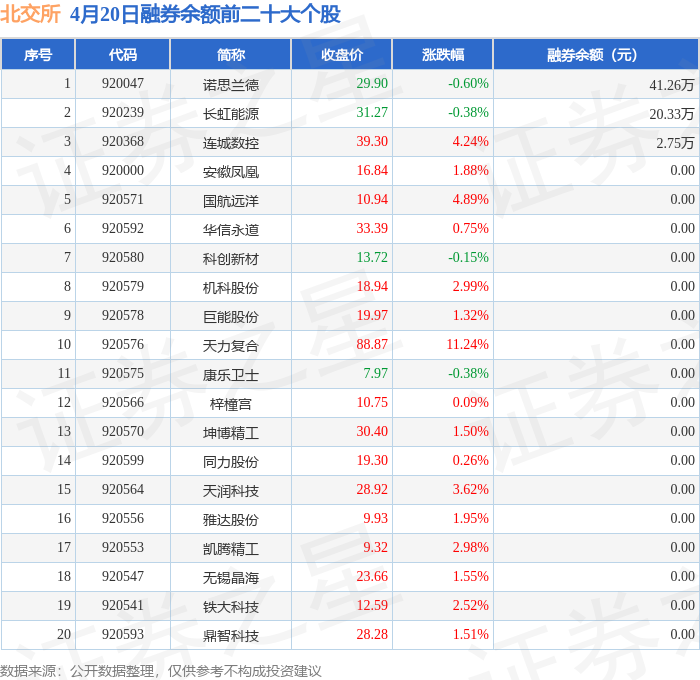 北交所融券余额前三分别为:诺思兰德(920047)融券余额41.26万元、长虹能源(920239)融券余额20.33万元、连城数控(920368)融券余额2.75万元,前20具体见下表:
