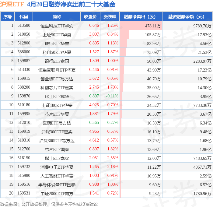 沪深ETF融券净卖出前三分别为:恒生科技ETF华安(513580)融券净卖出478.11万股、上证50ETF华夏(510050)融券净卖出105.87万股、银行ETF华宝(512800)融券净卖出83.98万股,前20具体见下表: