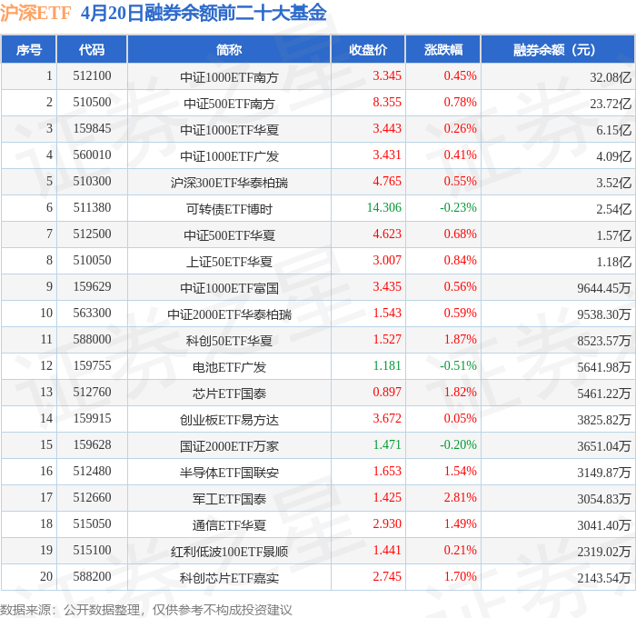 沪深ETF融券余额前三分别为:中证1000ETF南方(512100)融券余额32.08亿元、中证500ETF南方(510500)融券余额23.72亿元、中证1000ETF华夏(159845)融券余额6.15亿元,前20具体见下表: