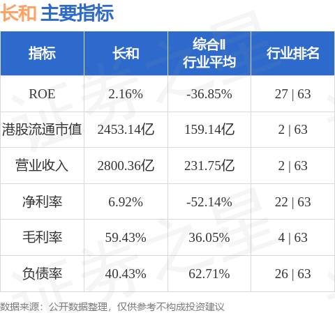 长和港股市值2453.14亿港元,在综合Ⅱ行业中排名第2。主要指标见下表:
