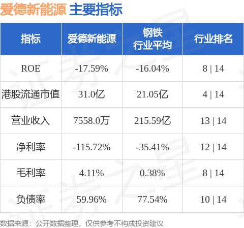 爱德新能源港股市值31亿港元,在钢铁行业中排名第4。主要指标见下表: