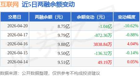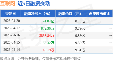 互联网:4月20日融资买入1.42亿元,融资融券余额8.75亿元