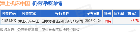 投行对该股的评级以增持为主,近90天内共有1家投行给出增持评级,近90天的目标均价为48.78港元。国泰海通证券股份有限公司最新一份研报给予津上机床中国增持评级,目标价48.78港元。