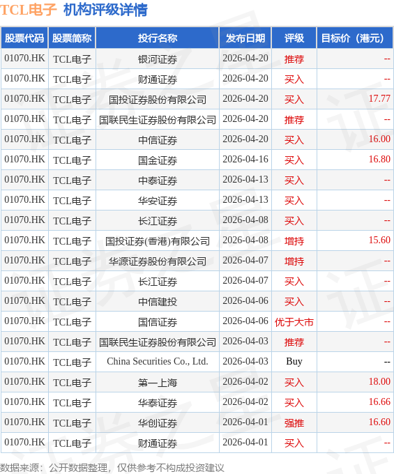 投行对该股的评级以买入为主,近90天内共有33家投行给出买入评级,近90天的目标均价为15.52港元。银河证券最新一份研报给予TCL电子推荐评级。