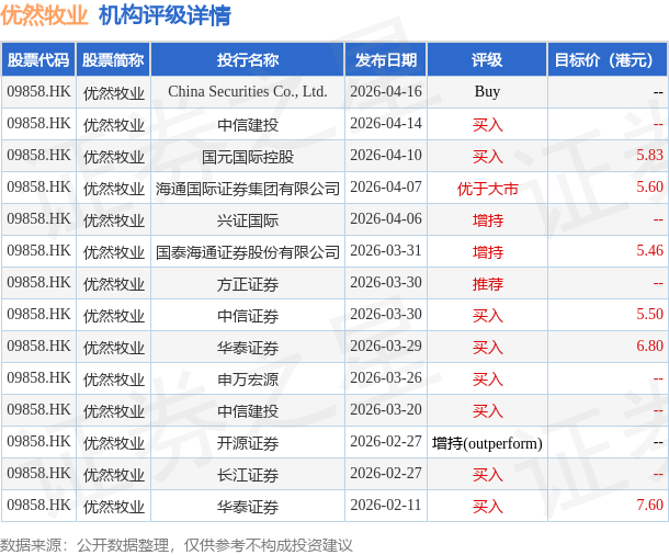 投行对该股的评级以买入为主,近90天内共有8家投行给出买入评级,近90天的目标均价为6.13港元。China Securities Co., Ltd.最新一份研报给予优然牧业Buy评级。