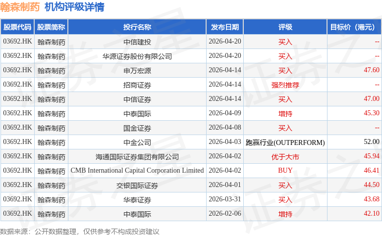 截至2026年4月21日收盘,翰森制药(03692.HK)报收于39.04港元,下跌2.16%,成交量609.98万股,成交额2.39亿港元。投行对该股的评级以买入为主,近90天内共有7家投行给出买入评级,近90天的目标均价为46.06港元。中信建投最新一份研报给予翰森制药买入评级。