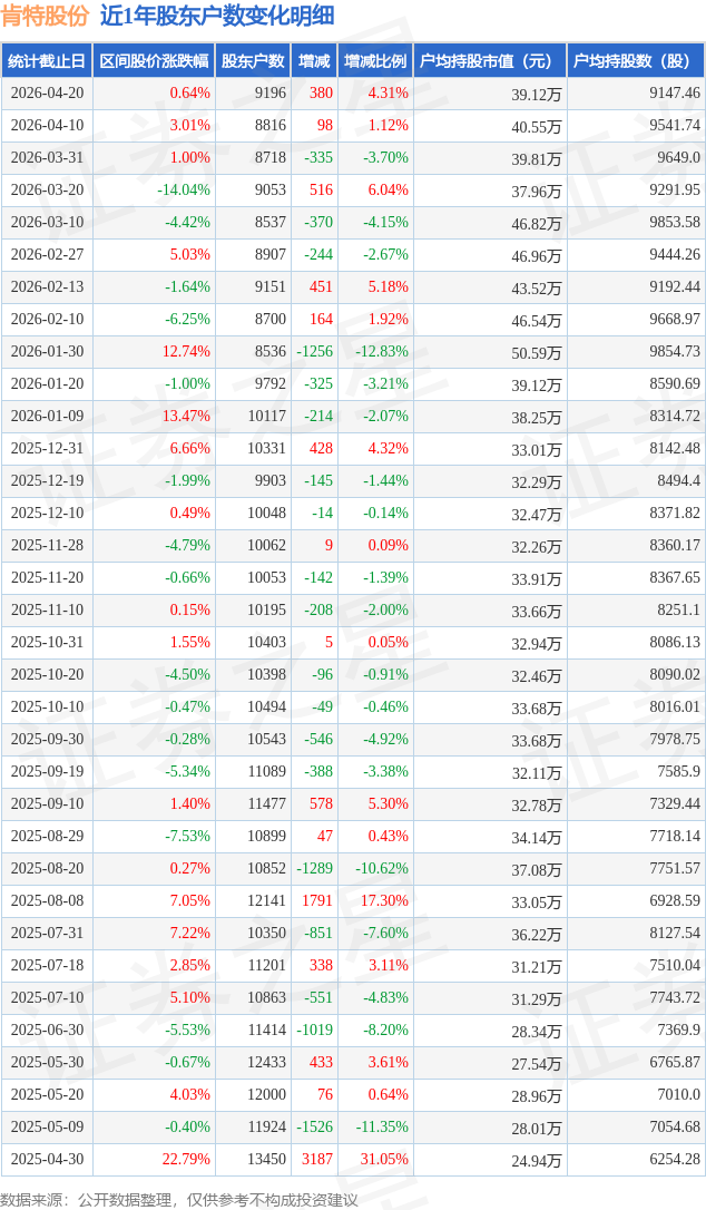 证券之星消息,近日肯特股份披露,截至2026年4月20日公司股东户数为9196.0户,较4月10日增加380.0户,增幅为4.31%。户均持股数量由上期的9542.0股减少至9147.0股,户均持股市值为39.12万元。