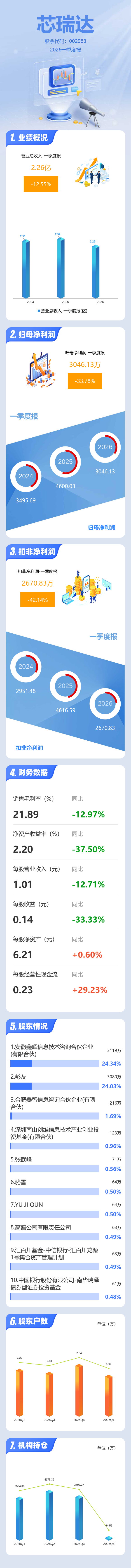 证券之星消息,芯瑞达2026年一季报显示,一季度公司主营收入2.26亿元,同比下降12.55%;归母净利润3046.13万元,同比下降33.78%;扣非净利润2670.83万元,同比下降42.15%;负债率28.46%,投资收益7.46万元,财务费用63.24万元,毛利率21.89%。