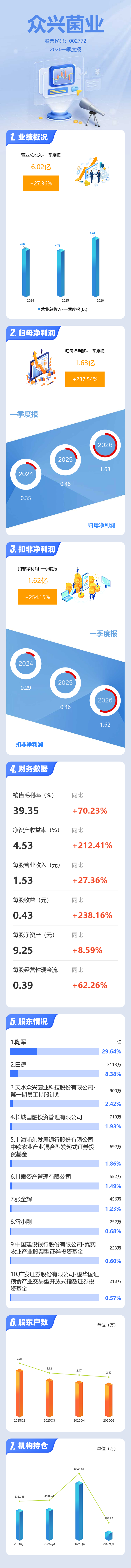 证券之星消息,众兴菌业2026年一季报显示,一季度公司主营收入6.02亿元,同比上升27.36%;归母净利润1.63亿元,同比上升237.55%;扣非净利润1.62亿元,同比上升254.15%;负债率52.91%,投资收益-15.58万元,财务费用1104.07万元,毛利率39.35%。