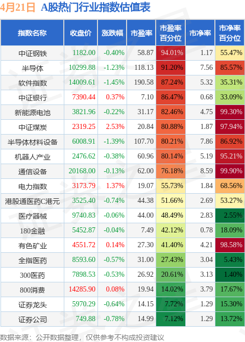 热门行业指数方面,中证钢铁的市盈率百分位较高,为94.01%。而证券公司的市盈率百分位较低,为7.12%。
