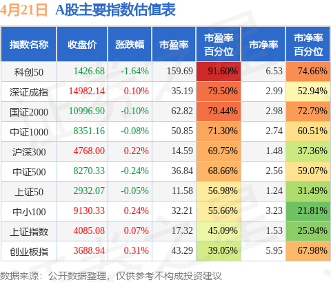 证券之星消息,4月21日A股收盘,上证综指指涨0.07%,报收4085.08点;深圳成指涨0.1%,报收14982.14点;创业板指涨0.31%,报收3688.94点。