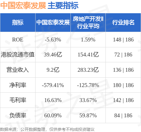 中国宏泰发展港股市值39.46亿港元,在房地产开发Ⅱ行业中排名第72。主要指标见下表: