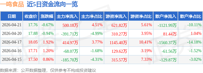 证券之星消息,截至2026年4月21日收盘,一鸣食品(605179)报收于17.76元,下跌0.67%,换手率1.54%,成交量6.17万手,成交额1.11亿元。