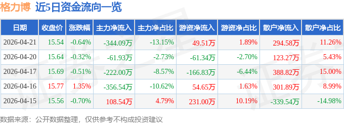 证券之星消息,截至2026年4月21日收盘,格力博(301260)报收于15.54元,下跌0.64%,换手率0.82%,成交量1.68万手,成交额2615.68万元。