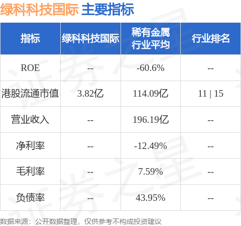 绿科科技国际港股市值3.82亿港元,在稀有金属行业中排名第11。主要指标见下表: