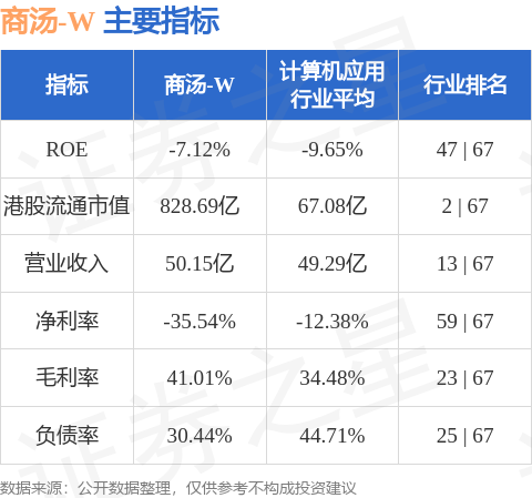 商汤-W港股市值828.69亿港元,在计算机应用行业中排名第2。主要指标见下表: