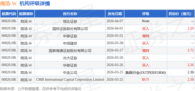 截至2026年4月21日收盘,商汤-W(00020.HK)报收于2.01港元,下跌1.95%,成交量2.72亿股,成交额5.44亿港元。投行对该股的评级以买入为主,近90天内共有4家投行给出买入评级,近90天的目标均价为2.4港元。信达证券最新一份研报给予商汤-WNone评级。