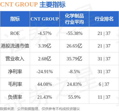 CNT GROUP港股市值3.39亿港元,在化学制品行业中排名第21。主要指标见下表: