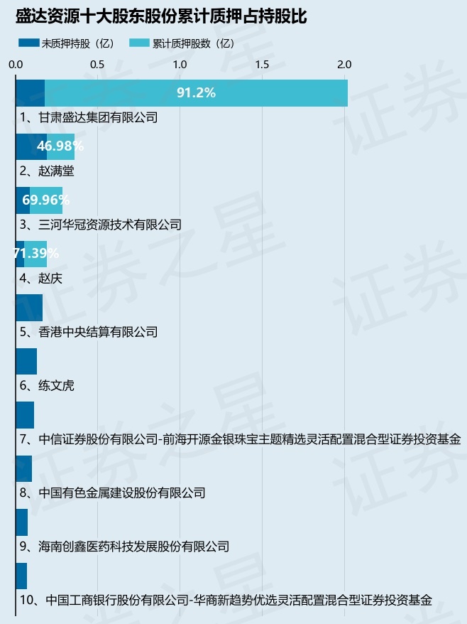 截止本公告日,股东甘肃盛达集团有限公司已累计质押股份1.84亿股,占其持股总数的91.2%,股东赵满堂已累计质押股份1700.0万股,占其持股总数的46.98%,股东三河华冠资源技术有限公司已累计质押股份2000.0万股,占其持股总数的69.96%,股东赵庆已累计质押股份1375.69万股,占其持股总数的71.39%。本次质押后盛达资源十大股东的累计质押股份占持股比例(占持股比例的计算以公司最新一期财务报表公布的十大股东的持股总数为基准)见下图: