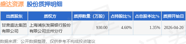 证券之星消息,盛达资源(000603)4月22日公开信息显示,股东甘肃盛达集团有限公司向上海浦东发展银行股份有限公司兰州分行合计质押930.0万股,占总股本1.35%。质押详情见下表: