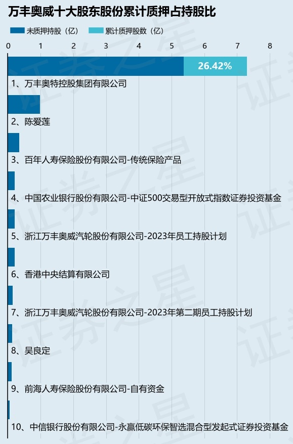 截止本公告日,股东万丰奥特控股集团有限公司已累计质押股份1.93亿股,占其持股总数的26.42%。本次质押后万丰奥威十大股东的累计质押股份占持股比例(占持股比例的计算以公司最新一期财务报表公布的十大股东的持股总数为基准)见下图: