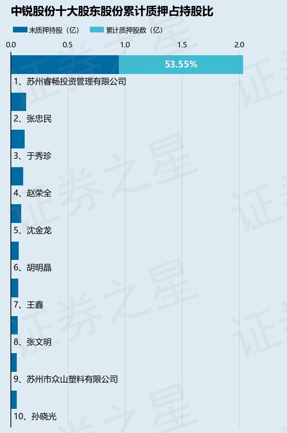 截止本公告日,股东苏州睿畅投资管理有限公司已累计质押股份1.09亿股,占其持股总数的53.55%。本次质押后中锐股份十大股东的累计质押股份占持股比例(占持股比例的计算以公司最新一期财务报表公布的十大股东的持股总数为基准)见下图: