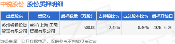 证券之星消息,中锐股份(002374)4月22日公开信息显示,股东苏州睿畅投资管理有限公司向兰祥(上海)国际贸易有限公司合计质押500.0万股,占总股本0.46%。质押详情见下表: