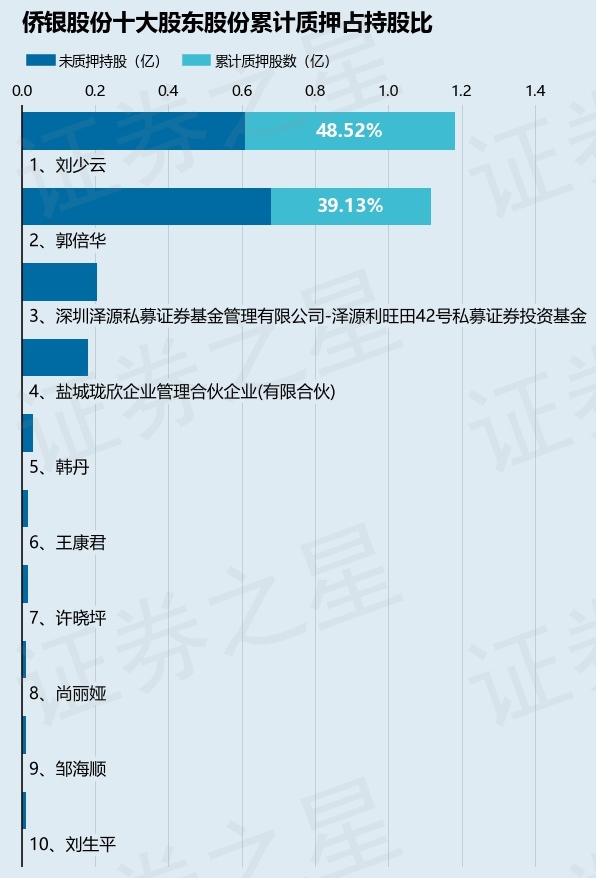 截止本公告日,股东刘少云已累计质押股份5733.0万股,占其持股总数的48.52%,股东郭倍华已累计质押股份4364.0万股,占其持股总数的39.13%。本次质押后侨银股份十大股东的累计质押股份占持股比例(占持股比例的计算以公司最新一期财务报表公布的十大股东的持股总数为基准)见下图: