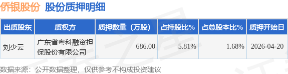 证券之星消息,侨银股份(002973)4月22日公开信息显示,股东刘少云向广东省粤科融资担保股份有限公司合计质押686.0万股,占总股本1.68%。质押详情见下表: