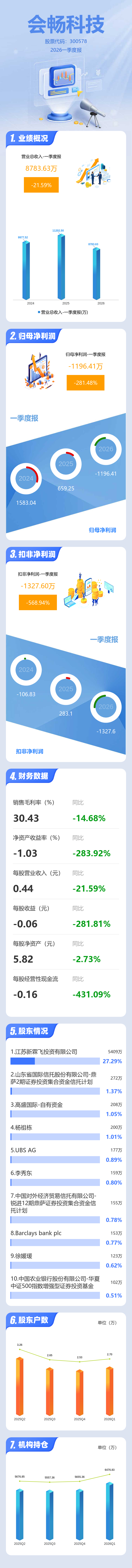 证券之星消息,会畅科技2026年一季报显示,一季度公司主营收入8783.63万元,同比下降21.59%;归母净利润-1196.41万元,同比下降281.48%;扣非净利润-1327.6万元,同比下降568.95%;负债率10.96%,投资收益75.06万元,财务费用126.31万元,毛利率30.43%。
