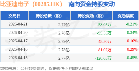 证券之星消息,4月21日南向资金减持58.05万股比亚迪电子(00285.HK)。近5个交易日中,获南向资金减持的有3天,累计净减持153.73万股。近20个交易日中,获南向资金增持的有13天,累计净增持1263.25万股。截至目前,南向资金持有比亚迪电子(00285.HK)2.77亿股,占公司已发行普通股的12.28%。