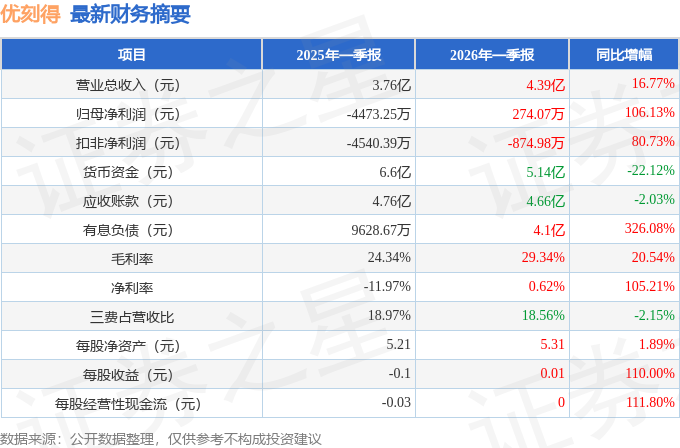 据证券之星公开数据整理,近期优刻得(688158)发布2026年一季报。截至本报告期末,公司营业总收入4.39亿元,同比上升16.77%,归母净利润274.07万元,同比上升106.13%。按单季度数据看,第一季度营业总收入4.39亿元,同比上升16.77%,第一季度归母净利润274.07万元,同比上升106.13%。本报告期优刻得盈利能力上升,毛利率同比增幅20.54%,净利率同比增幅105.21%。