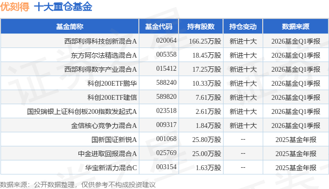持有优刻得最多的基金为西部利得科技创新混合A,目前规模为0.57亿元,最新净值1.8969(4月21日),较上一交易日下跌2.26%,近一年上涨57.67%。该基金现任基金经理为吴海健。
