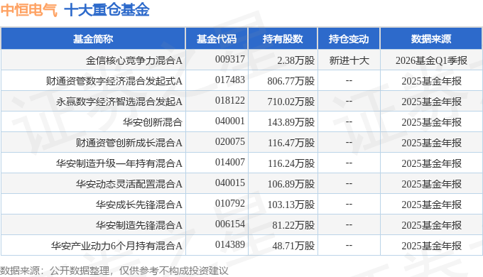 持有中恒电气最多的基金为金信核心竞争力混合A,目前规模为0.14亿元,最新净值1.3853(4月21日),较上一交易日下跌2.52%,近一年上涨54.45%。该基金现任基金经理为谭佳俊。