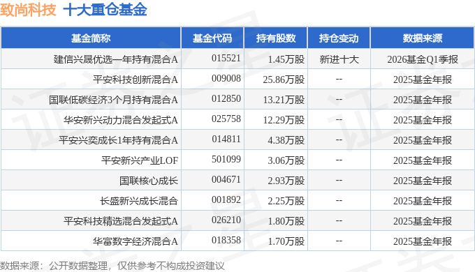 持有致尚科技最多的基金为建信兴晟优选一年持有混合A,目前规模为0.45亿元,最新净值0.938(4月21日),较上一交易日上涨0.94%,近一年上涨18.28%。该基金现任基金经理为孙晟。
