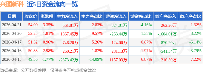 证券之星消息,截至2026年4月21日收盘,兴图新科(688081)报收于54.0元,上涨3.35%,换手率3.64%,成交量3.75万手,成交额1.98亿元。