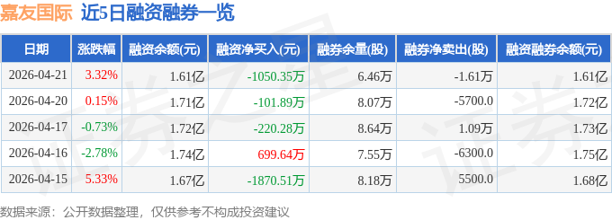 嘉友国际融资融券信息显示,融资方面,当日融资买入1067.23万元,融资偿还2117.59万元,融资净偿还1050.35万元。融券方面,融券卖出1600.0股,融券偿还1.77万股,融券余量6.46万股,融券余额90.51万元。融资融券余额1.61亿元。