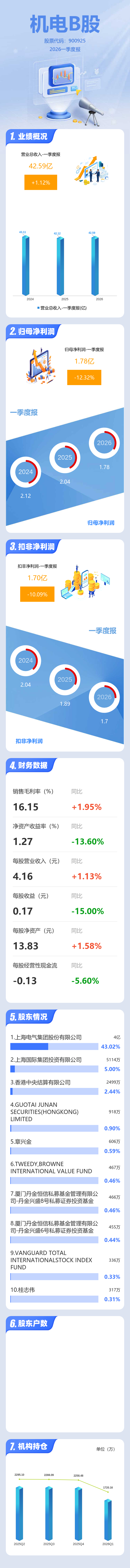 证券之星消息,机电B股2026年一季报显示,一季度公司主营收入42.59亿元,同比上升1.13%;归母净利润1.78亿元,同比下降12.32%;扣非净利润1.7亿元,同比下降10.1%;负债率48.09%,投资收益6416.22万元,财务费用-3631.24万元,毛利率16.15%。
