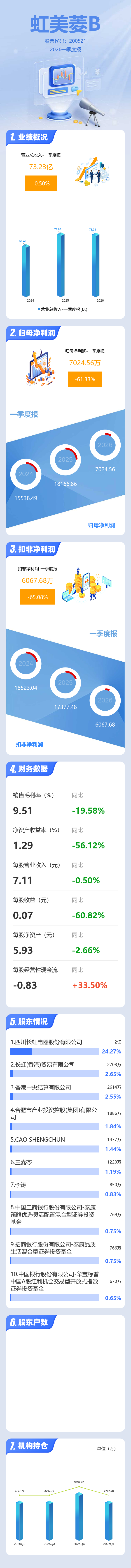 证券之星消息,虹美菱B2026年一季报显示,一季度公司主营收入73.23亿元,同比下降0.51%;归母净利润7024.56万元,同比下降61.33%;扣非净利润6067.68万元,同比下降65.08%;负债率71.93%,投资收益2571.0万元,财务费用-1358.2万元,毛利率9.51%。