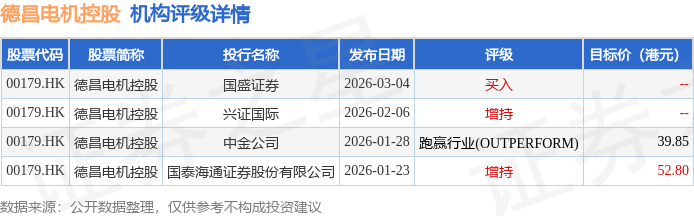 投行对该股的评级以增持为主,近90天内共有2家投行给出增持评级,近90天的目标均价为46.32港元。国盛证券最新一份研报给予德昌电机控股买入评级。