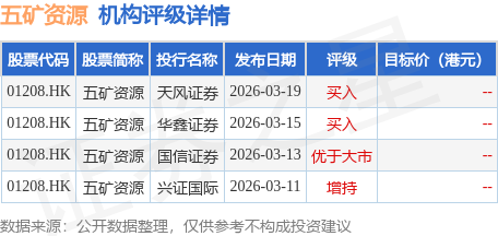 投行对该股的评级以买入为主,近90天内共有2家投行给出买入评级。天风证券最新一份研报给予五矿资源买入评级。