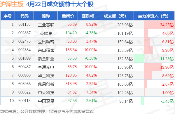 当日沪深主板成交额前10大个股中7只个股收涨,平均涨幅6.61%,其中工业富联(601138)以成交额203.98亿元排第一。从主力资金流入看,成交额前10大个股中有8只个股呈现主力资金净流入。