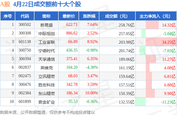 当日A股成交额前10大个股中7只个股收涨,平均涨幅6.07%,其中新易盛(300502)以成交额258.76亿元排第一。从主力资金流入看,成交额前10大个股中有7只个股呈现主力资金净流入。