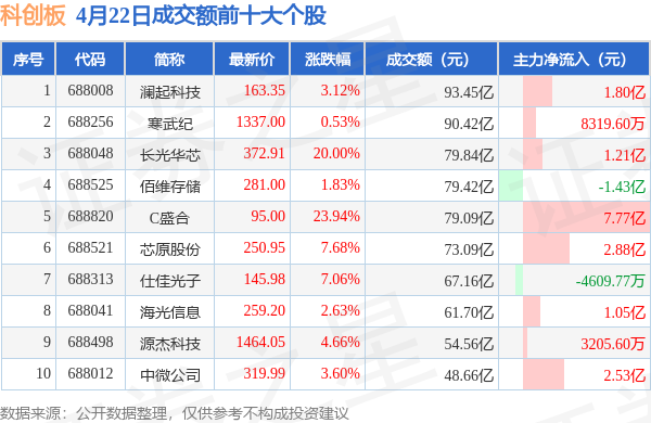 当日科创板成交额前10大个股全线收涨,平均涨幅7.5%,其中澜起科技(688008)以成交额93.45亿元排第一。从主力资金流入看,成交额前10大个股中有8只个股呈现主力资金净流入。