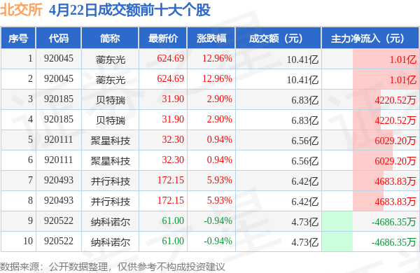 当日北交所成交额前10大个股中8只个股收涨,平均涨幅5.68%,其中蘅东光(920045)以成交额10.41亿元排第一。从主力资金流入看,成交额前10大个股中有8只个股呈现主力资金净流入。